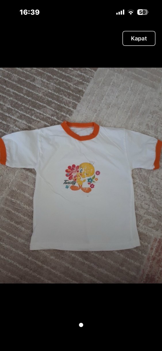 Rahat kesim kız çocuk tişörtü, kısa kollu ve yuvarlak yakalıdır. Yumuşak, sıcak kumaş üzerine renkli baskılar ve turuncu detaylar bulunur.