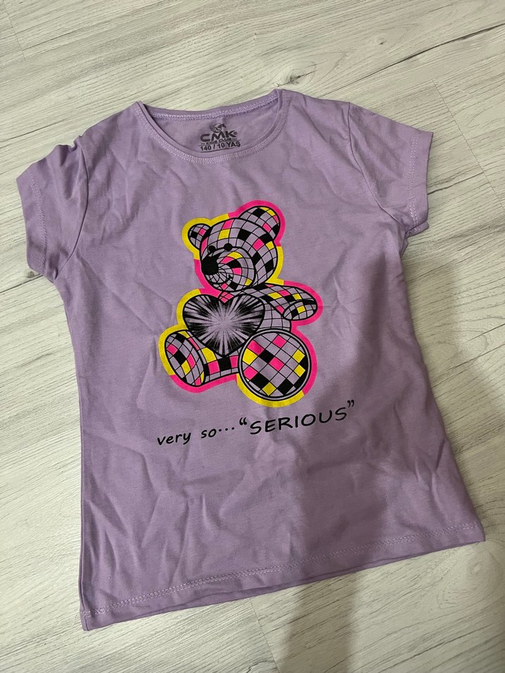 Mor renkli, kız çocukları için dar kesim kısa kollu tişört, renkli ayı baskısı ve yuvarlak yaka içerir. Yumuşak sentetik kumaştan yapılmıştır ve düğme detayı vardır.