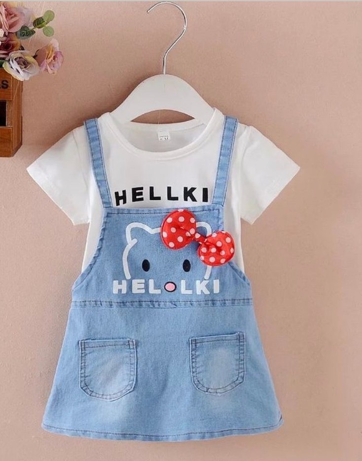 Kısa kollu, baskılı tişört ve cepli kot önlükten oluşan renkli, fitted kız çocuk elbisesi. Velcro kapamalı, crew neck yaka tasarımıyla dikkat çeker.