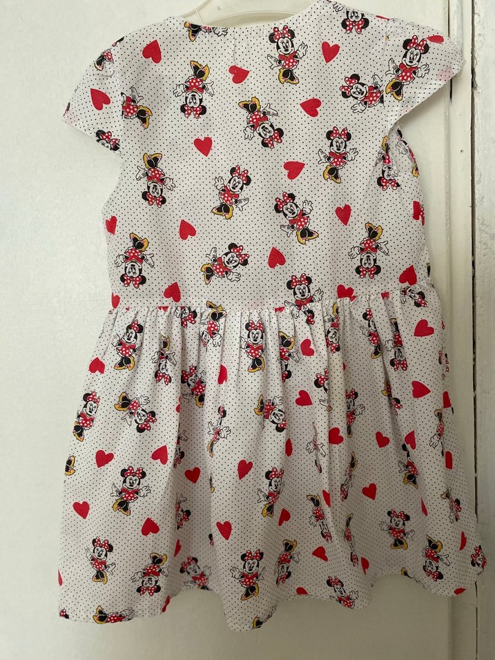 Pamuklu, kısa kollu, V yakalı kız çocuk elbisesi. Renkli Minnie Mouse baskıları ve etek kısmında fırfır detayları bulunur. ❤️