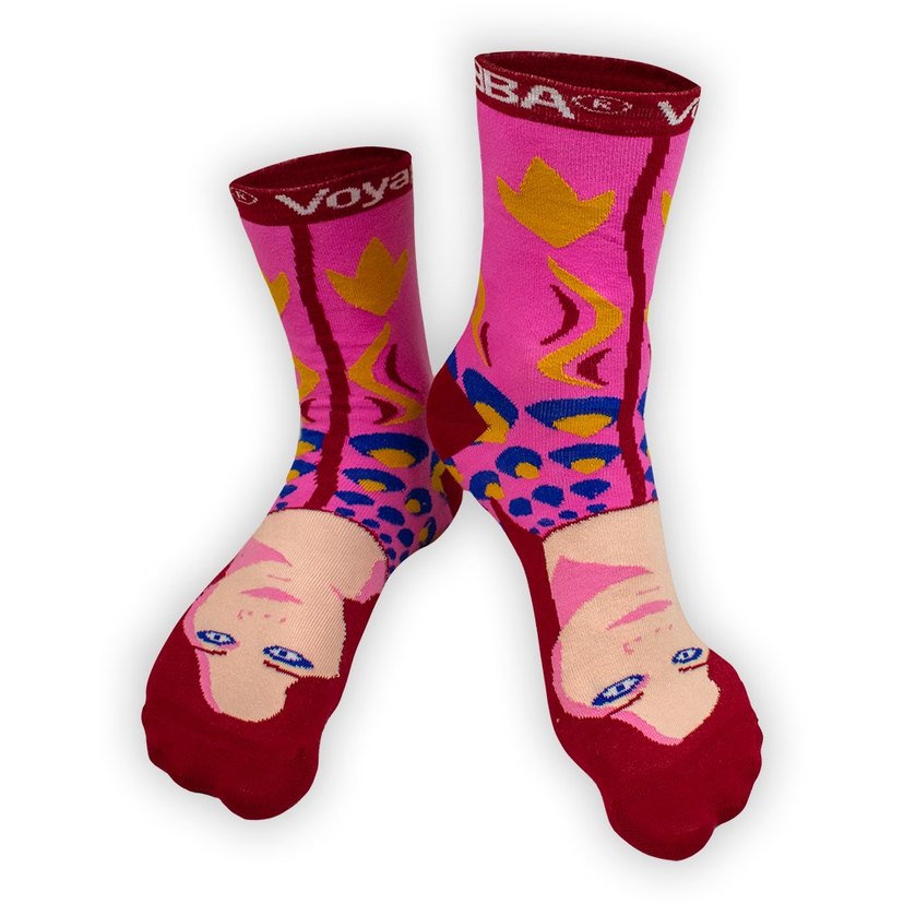 Sentetik kumaştan yapılmış, karakter yüzleri baskılı renkli pembe kız çocuk çorabı.