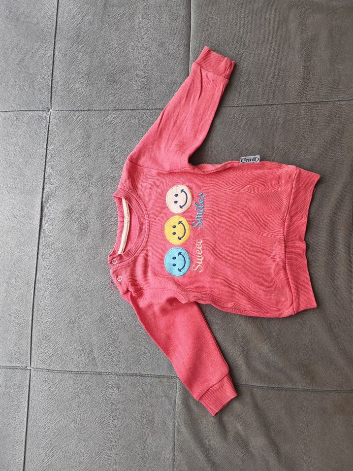 Kız çocukları için uzun kollu, yuvarlak yaka ve bol kesim pembe sweatshirt. Yumuşak ve sıcak kumaştan, renkli gülen yüz baskıları ve omuzda düğme detaylıdır.