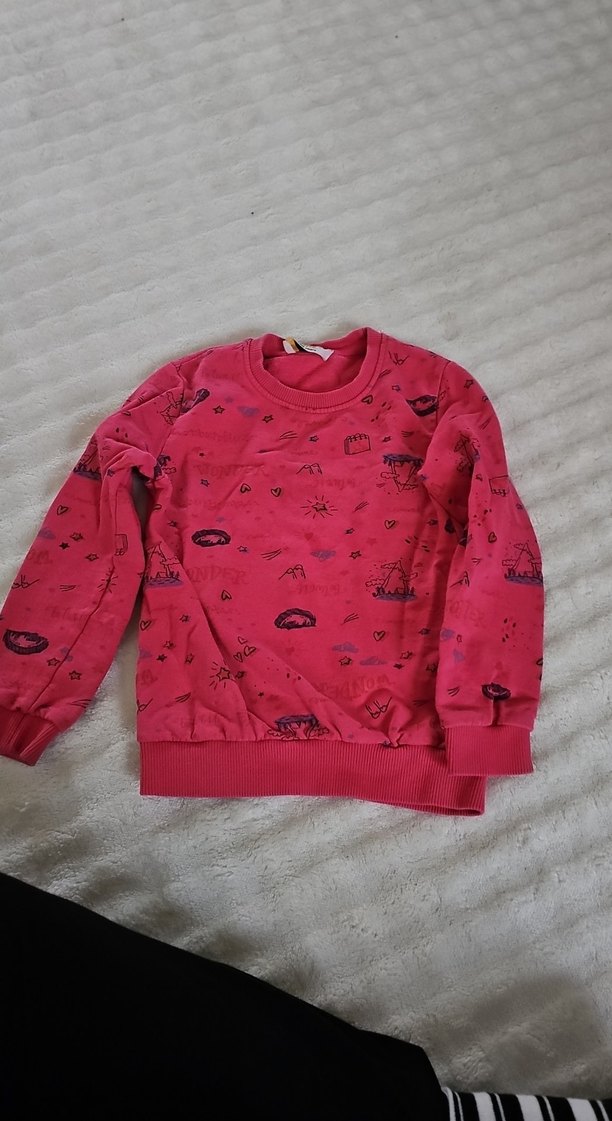 Pembe renkli kız çocuk sweatshirtü, uzun kollu ve yuvarlak yakalıdır. Renkli baskılarla süslenmiş, yumuşak, örgü tüylü kumaştan yapılmıştır ve bol kesimdir.