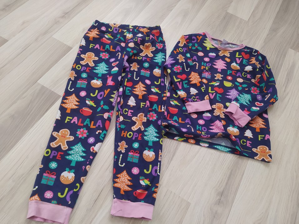 Kız çocukları için uzun kollu, yuvarlak yakalı, yumuşak ve sıcak örme polar kumaştan yapılmış renkli baskılı pijama takımı. Elastik bel ve pembe manşetli pantolon içerir.