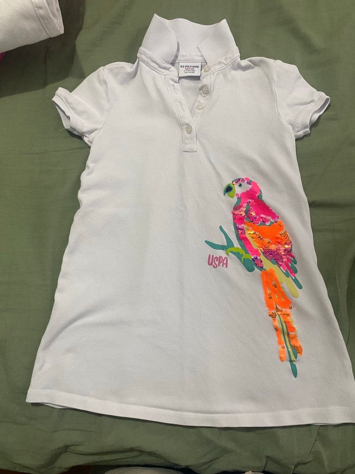 Kız çocukları için beyaz, fitted kesim polo tişört. Yakalı ve kısa kollu, renkli papağan baskısı ve USPA logosu bulunur. Sentetik kumaştan üretilmiştir. 2.resimde belli belirsiz leke var leke çıkarıcım olmadığı için çıkaramadım o yüzden fiyat bi tık uygun