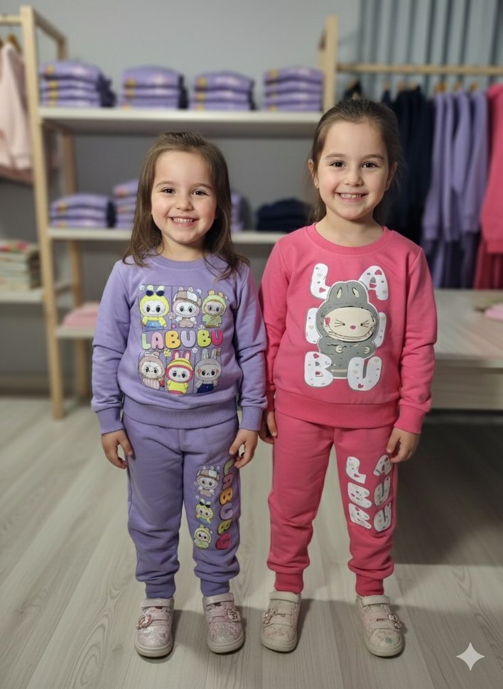 Rahat kesim, uzun kollu ve bisiklet yaka kız çocuk eşofman takımı. Yumuşak örme kumaştan, renkli baskılar ve 'LABUB' yazısı içerir. 2.8 yas arası mevcuttur.