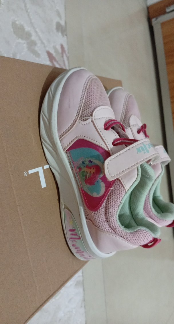 Pembe renkli, renkli baskılı detaylara ve cırt cırtlı kapanışa sahip kız çocuk spor ayakkabısı. Rahatlık için kauçuk tabanlı, trend sokak stili için uygun.