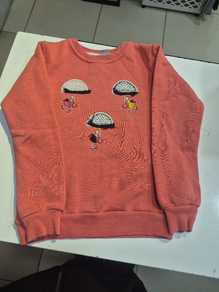 Kız çocuk sweatshirt, yuvarlak yaka ve uzun kolludur. Yumuşak fleece kumaştan yapılmış, renkli baskılar ve örme detaylar içerir, rahat kesimlidir.
