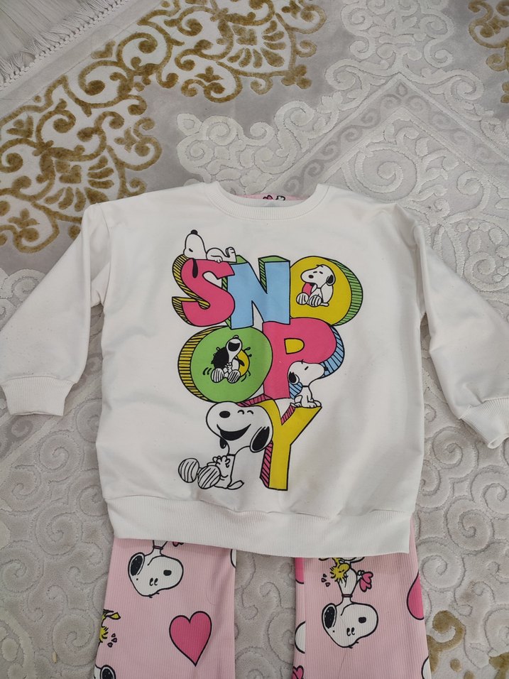 Kız çocukları için rahat kesim, uzun kollu ve yuvarlak yakalı, yumuşak dokulu, renkli Snoopy baskılı sweatshirt alt üst takım