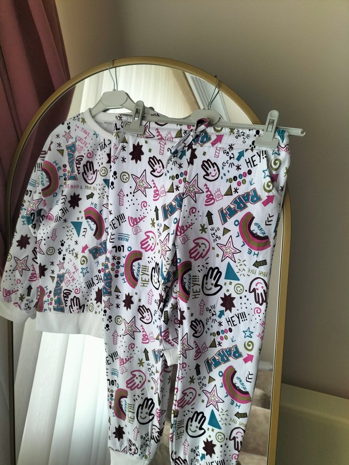 Renkli baskılı, uzun kollu ve yuvarlak yakalı kız çocuk pijama takımı, yumuşak tekstil kumaştan üretilmiştir. 7,8 yaşa uygun