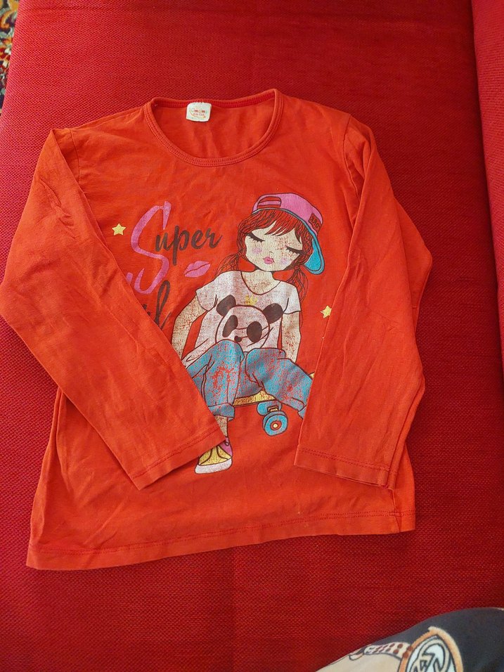 Kız çocukları için kırmızı uzun kollu tişört, renkli baskılı ve yuvarlak yakalıdır. Örme pamuktan üretilmiş, rahat sokak stili için bol kesimdir.