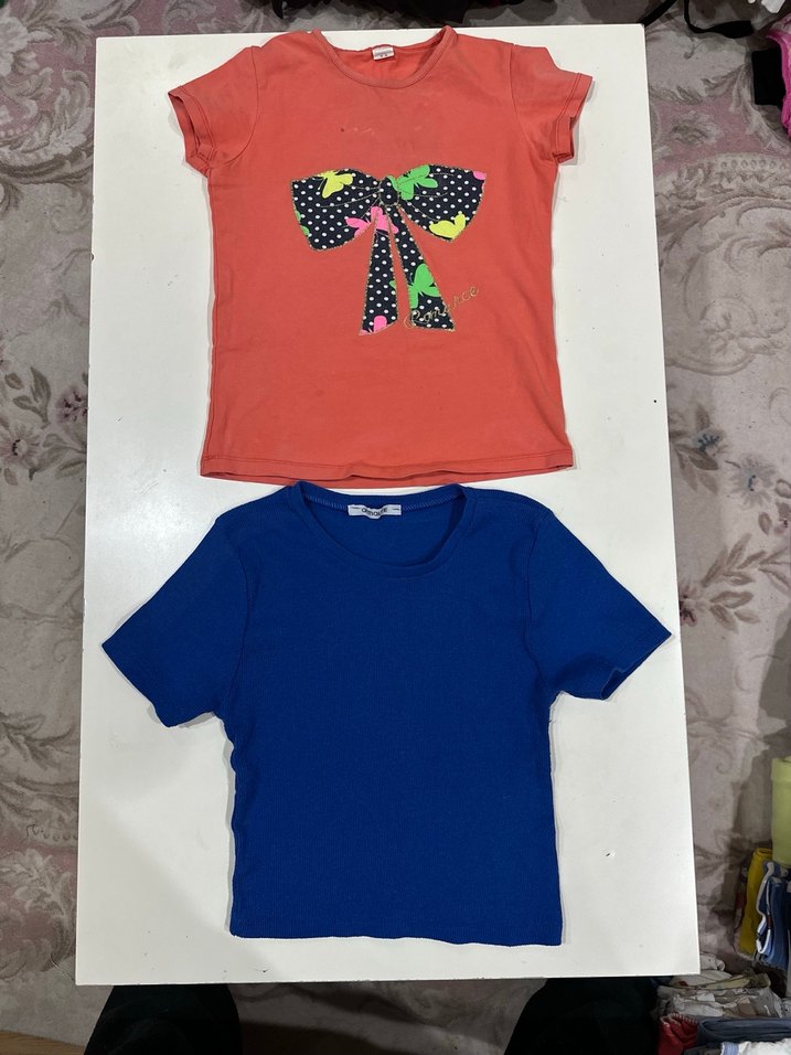 Yumuşak sentetik kumaştan, önü fiyonk baskılı renkli ve düz mavi kısa kollu, dar kesim iki tişört seti. Trendy rahat stil için uygun. 2li kombin tek fiyat.