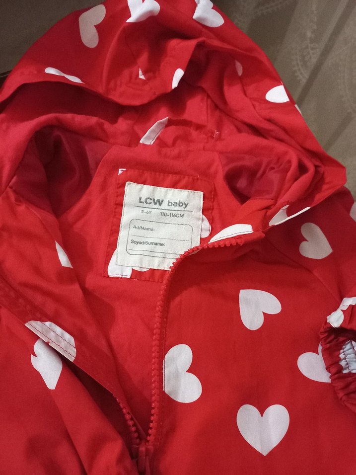 Kırmızı renkli, kalp desenli kız çocuk yağmurluğu, çıtçıtlı yakalı ve fermuarlı. Sentetik kumaştan, bol kesim ve sokak stili. LCW baby etiketli. ☔