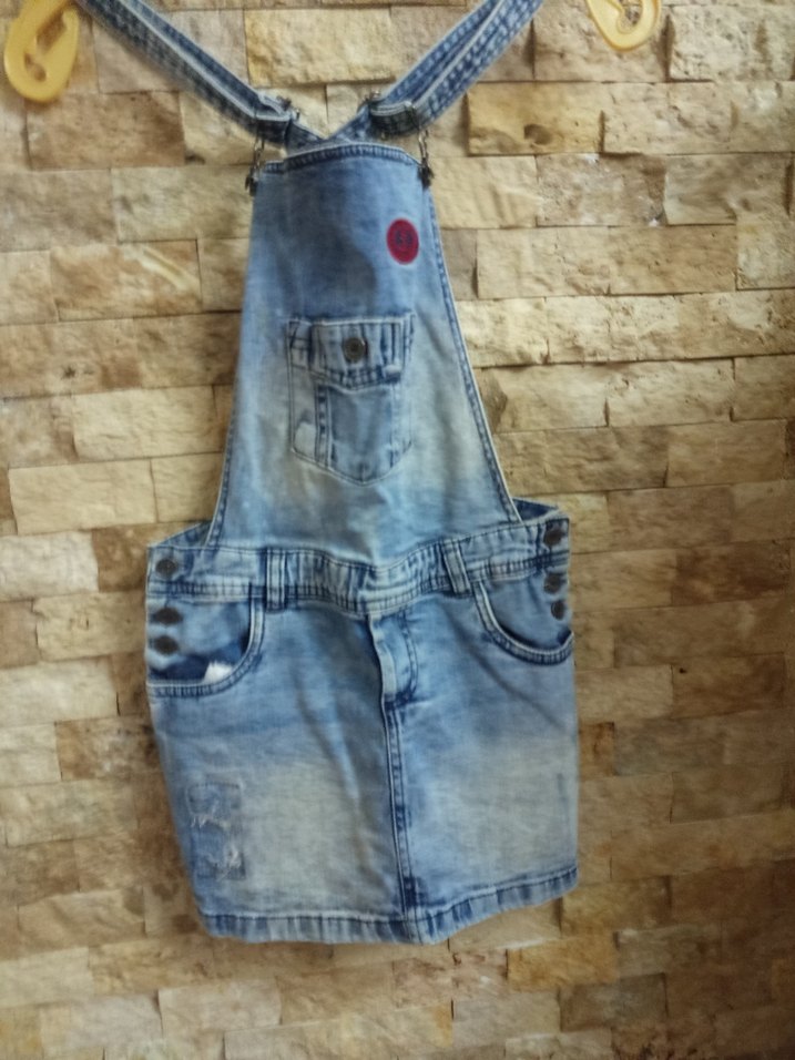 Renkli batik desenli, düğmeli askılı, fitted kesim kız çocuk mavi denim salopet. 12 yaşa uyumludur(152 cm)
