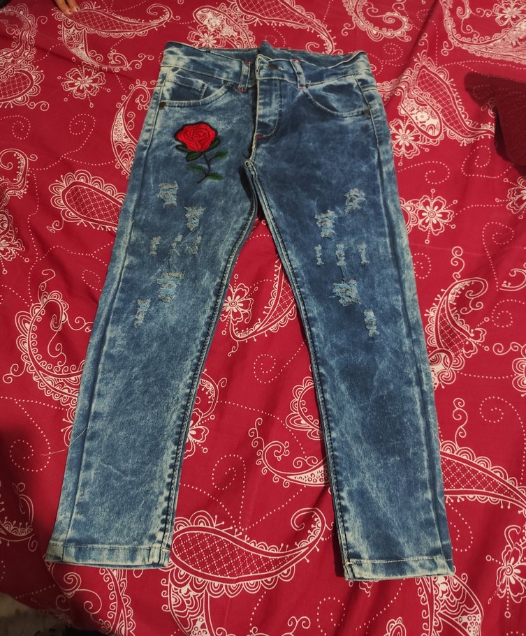 Renkli batik desenli, düğmeli, bol kesim kız çocuk kot pantolon. Kırmızı gül işlemeli ve yırtık detaylı, trend sokak stili için uygun.