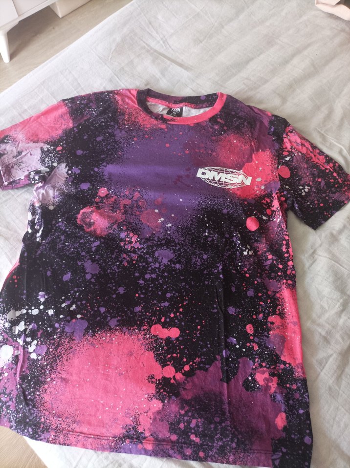 Kız çocukları için renkli batik desenli, kısa kollu ve yuvarlak yaka tişört. Yumuşak sentetik kumaştan, bol kesim ve rahat sokak stili sunar.