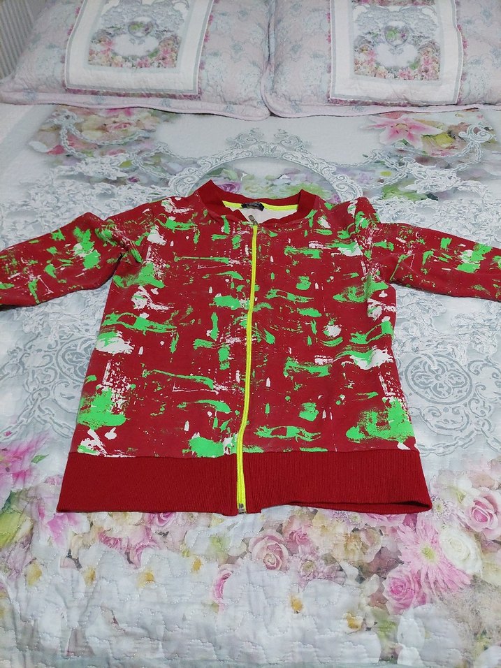 Kız çocukları için renkli batik desenli, fermuarlı ve yuvarlak yaka bir ceket. Bol kesim, yumuşak ve sıcak kumaştan, sokak stiline uygun.