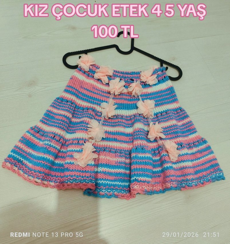 Kız çocuklar için bol kesim, pastel renklerde batik desenli yumuşak örgü etek. Örgü çiçek detaylarıyla bohem tarzda.