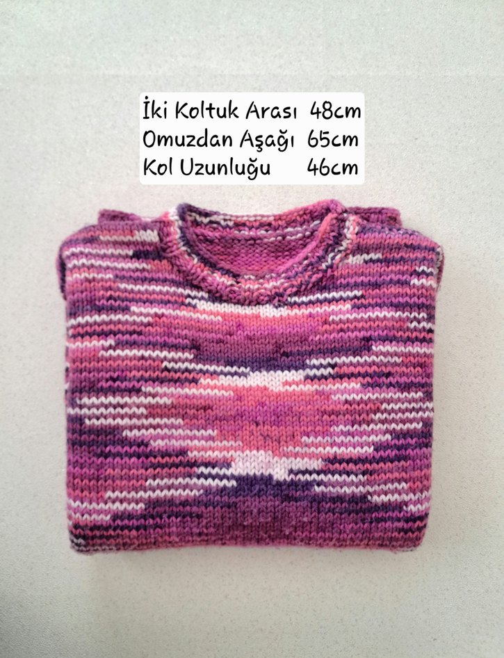 10-12 yaş.. El Örgüsüdür.. İnceleyerek alınız.. Renkli pembe batik desenli örgü kız çocuk kazak, yuvarlak yaka ve uzun kolludur. Bol kesim ve bohem tarzındadır. Ölçüler: İki koltuk arası 48cm, omuzdan aşağı 65cm, kol uzunluğu 46cm.