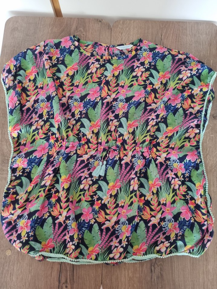 Kısa kollu, yuvarlak yakalı, bol kesim kız çocuk ponchosu, renkli tie-dye desenli ve fırfırlı detaylı, sentetik kumaştan bohem tarzda.