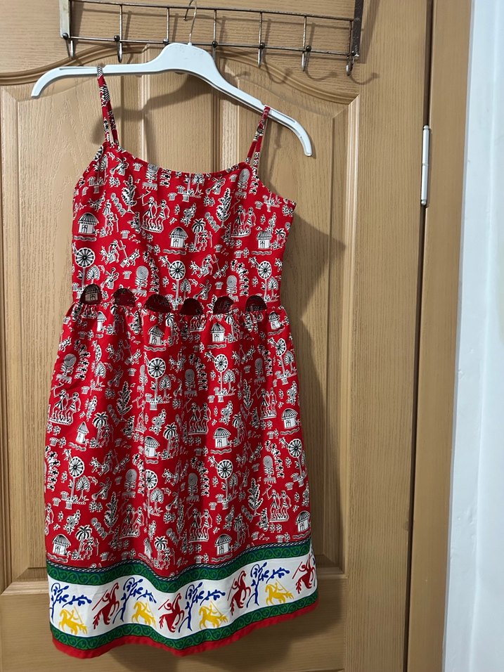 Kız çocuklar için renkli, bohem tarzda, askısız ve fırfırlı detaylı, bol kesim yazlık elbise. Canlı desenli tekstil kumaştan üretilmiştir.