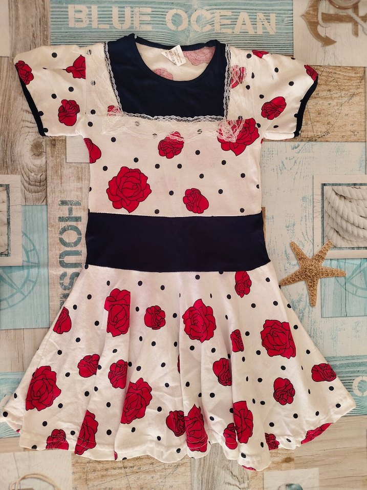 Renkli çiçekli baskılı kız çocuk elbisesi, beyaz zemin üzerine kırmızı güller ve siyah puantiyelerle kısa kollu ve fırfırlı, bohem tarzda.
