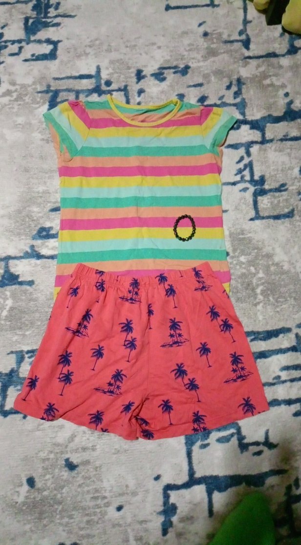 Rahat kesim, kısa kollu, pastel renkli çizgili tişört ve palmiye desenli mercan şorttan oluşan yumuşak sentetik kumaş takım.