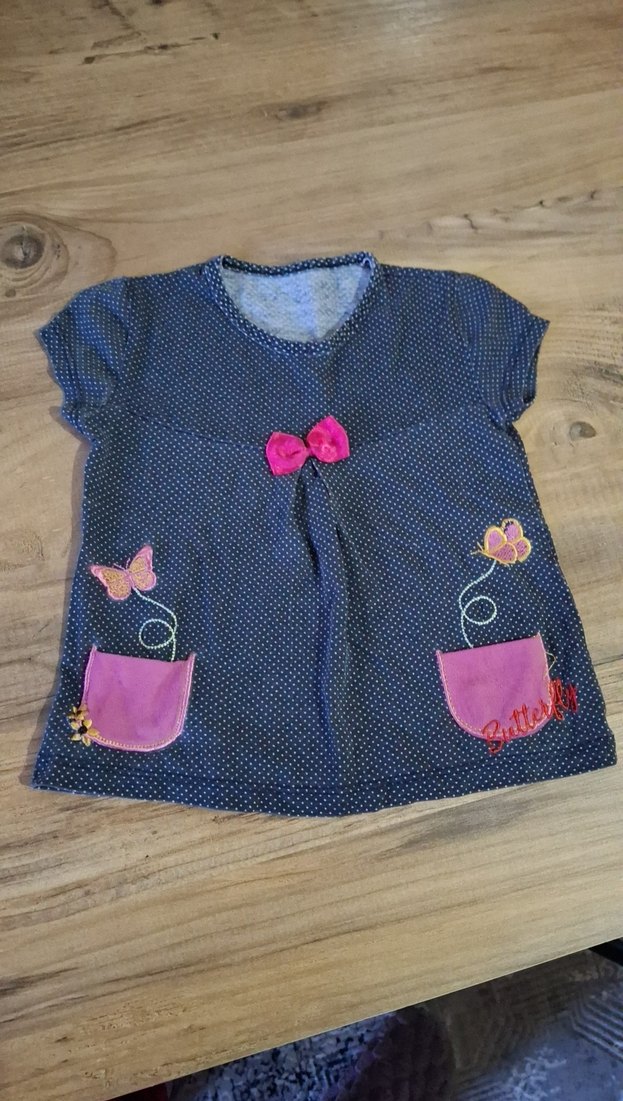 Kız çocuklar için mavi denim gorunumlu elbise, kısa kollu ve yuvarlak yakalıdır. Renkli kelebek baskıları ve düğme detaylarıyla bohem bir tarz sunar. Önünde iki pembe cep bulunur.