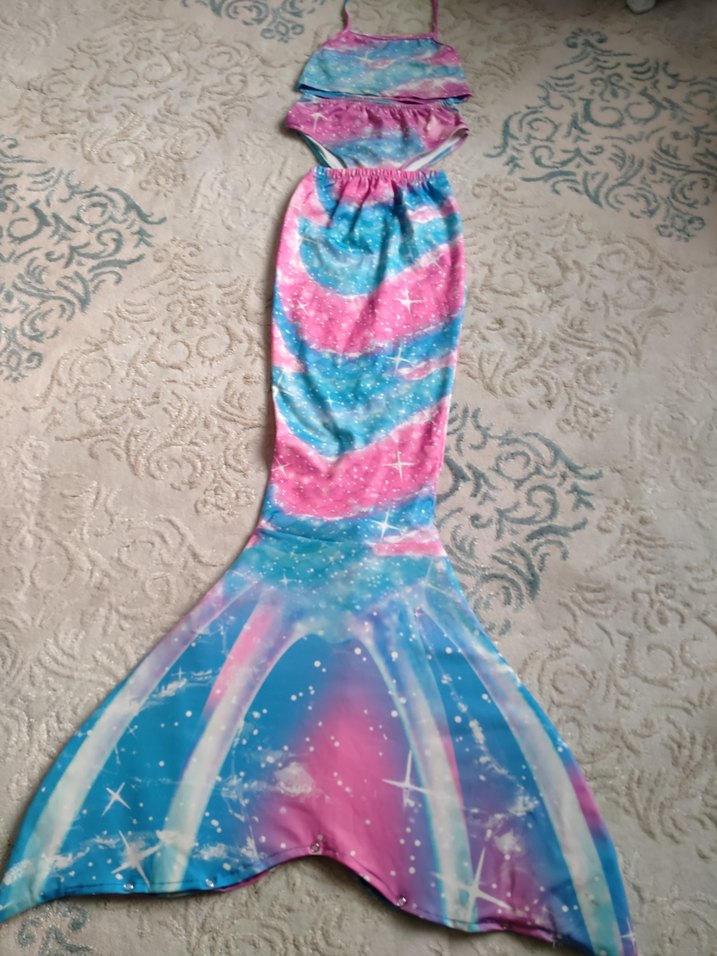 Sentetik kumaştan yapılmış, renkli batik desenli kız çocuk deniz kızı kostümü, üst ve kuyruk şeklinde alt parçadan oluşur. ♀️