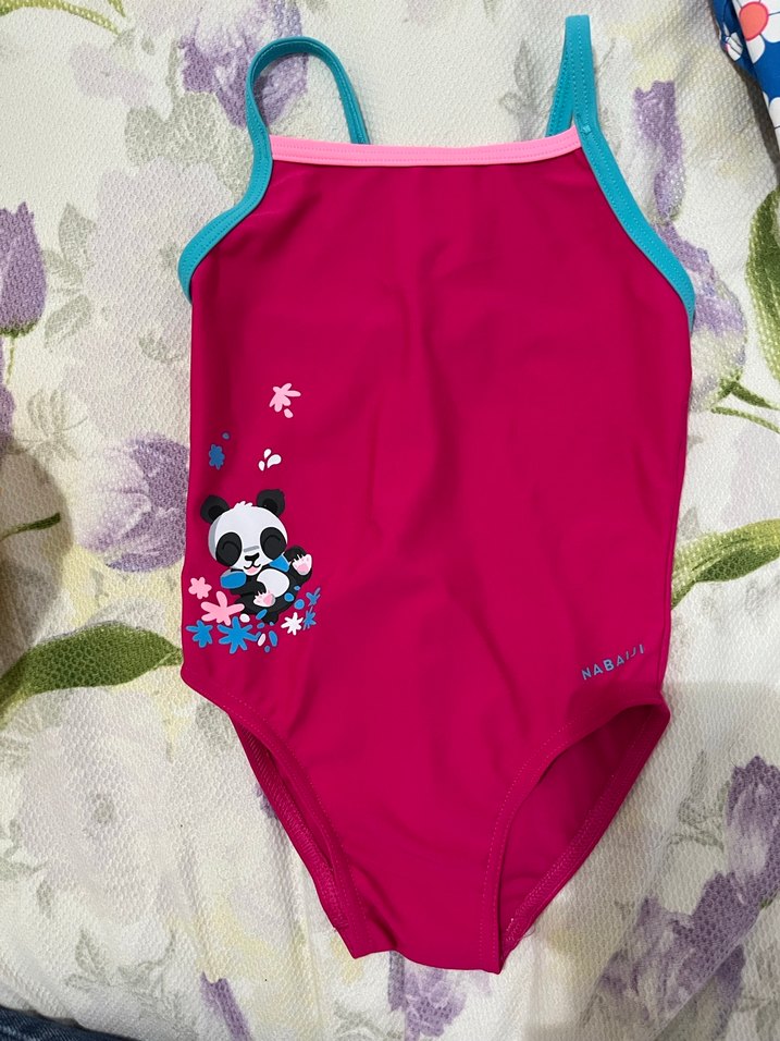 İnce askılı, renkli panda desenli kız çocuk mayo. Canlı pembe ve mavi tonlarıyla konforlu bir kullanım sunar.
