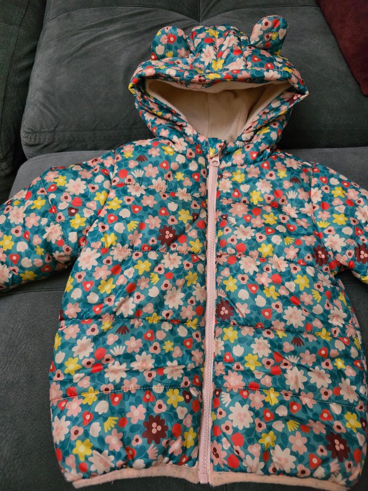 Renkli çiçek desenli, kapüşonlu ve fermuarlı kız çocuk montu. Yumuşak ve sıcak kumaştan, günlük sokak stili için uygun. 3 yas