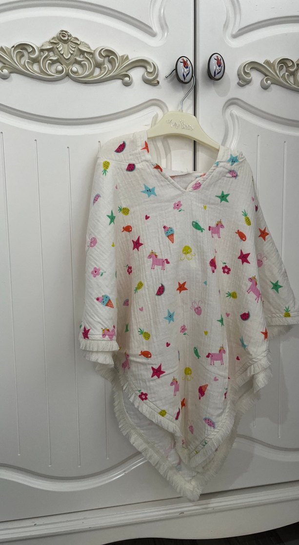 Kız çocukları için pamuklu müslin kumaş Pastel renkli desenli, renkli baskılı ve fırfır detaylıdır. Bohem tarzda müslin havludur boydan geçirmeli