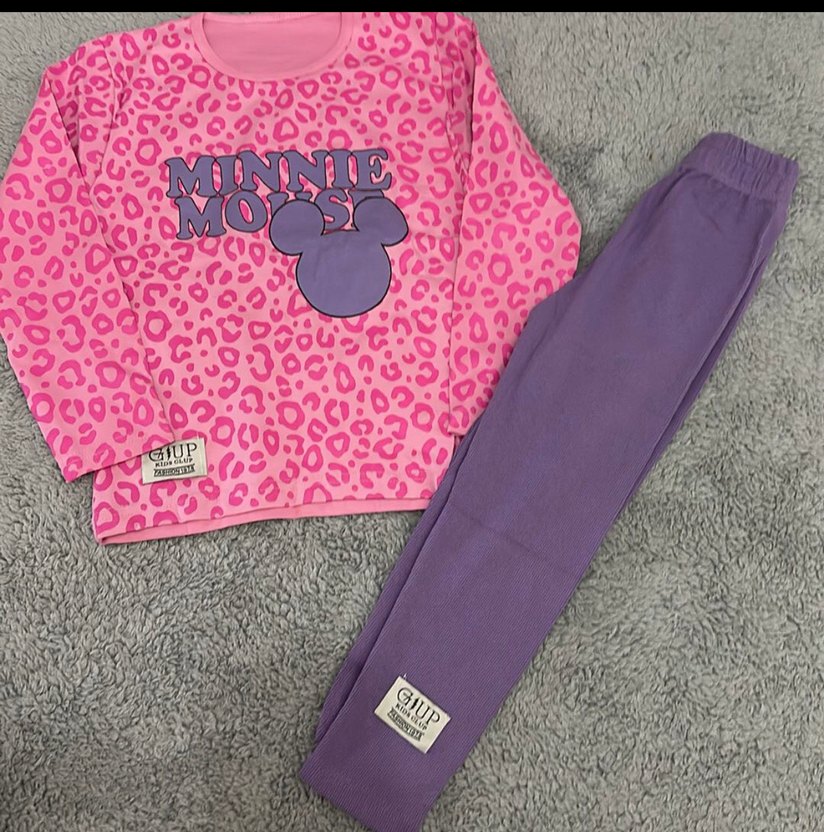 Renkli, pembe baskılı üstü Minnie Mouse desenli, uzun kollu ve kürklü detaylı, mor pantolonlu kız çocuk eşofman takımı.
