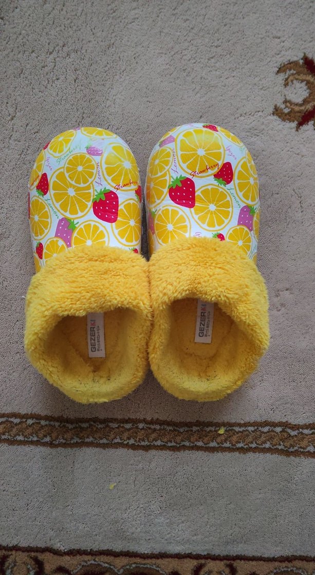 Kız çocukları için renkli baskılı, sarı yumuşak peluş astarlı ve cırt cırtlı sıcak terlikler, bohem ve retro pop kültür tarzında. Hediye geldi. Küçük geldiği için giyilmedi