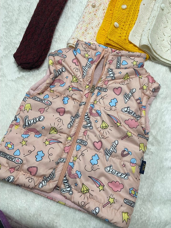 Kız çocuklar için renkli desenli, askısız yaka ve bol kesim yelek. Sentetik kumaştan, örme detaylı ve rahat bir tarz sunar.