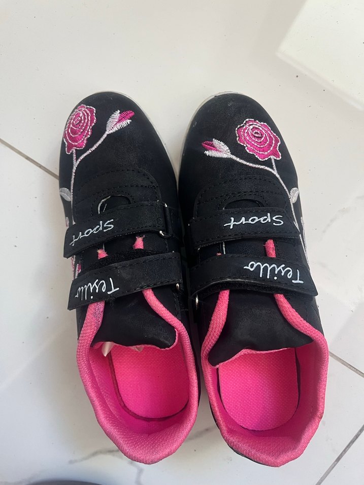 Kız çocukları için renkli desenli, cırt cırtlı spor ayakkabılar. Kauçuk tabanlı ve pembe iç astarlı, sokak stili için uygun.
