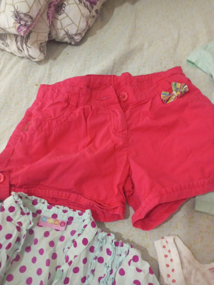 Kız çocukları için pamuk, düğmeli, bol kesim pembe şort. Sokak tarzı, renkli küçük fiyonk detayıyla trend bir görünüm sunar.