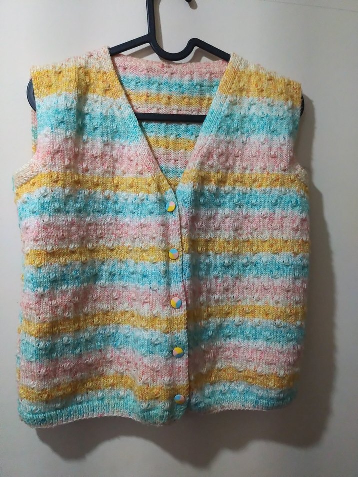 Kız çocukları için örgü, kolsuz, gevşek kesim, pastel renkli tie-dye desenli, V yaka, düğmeli bohem tarz süveter.