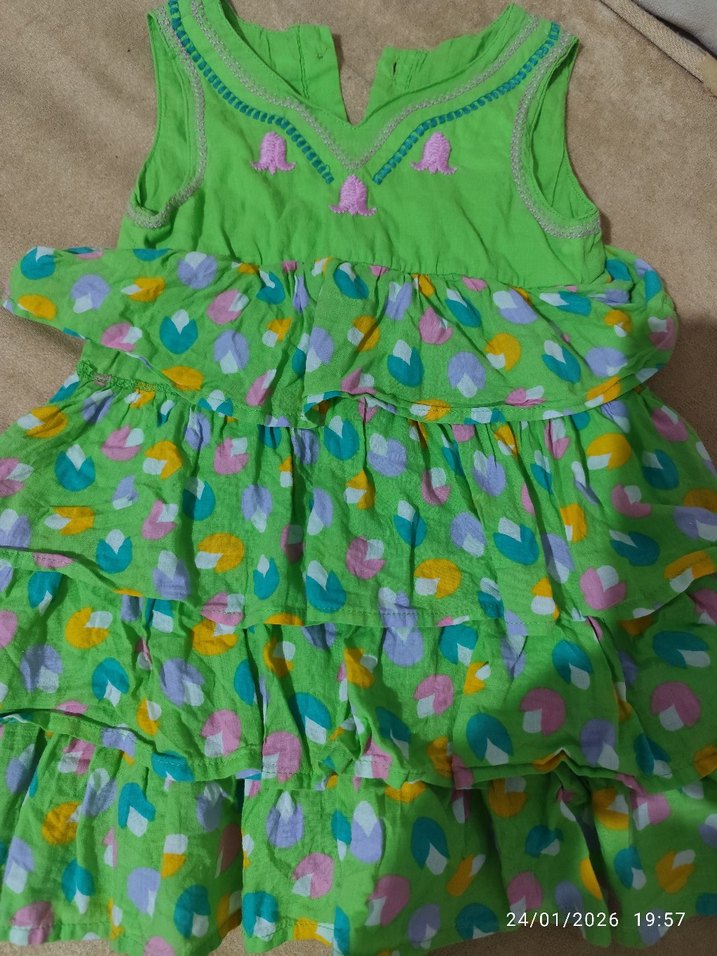 Kolsuz, renkli tie-dye desenli, fırfırlı ve bol kesim kız çocuk elbisesi. Yumuşak pamuk kumaştan, V yakalı, bohem tarzda.
