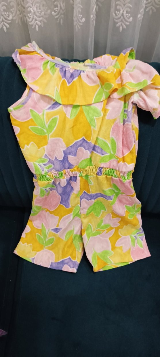 Kız çocukları için kolsuz, bol kesim, pastel renklerde batik desenli ve fırfırlı detaylara sahip tulum.