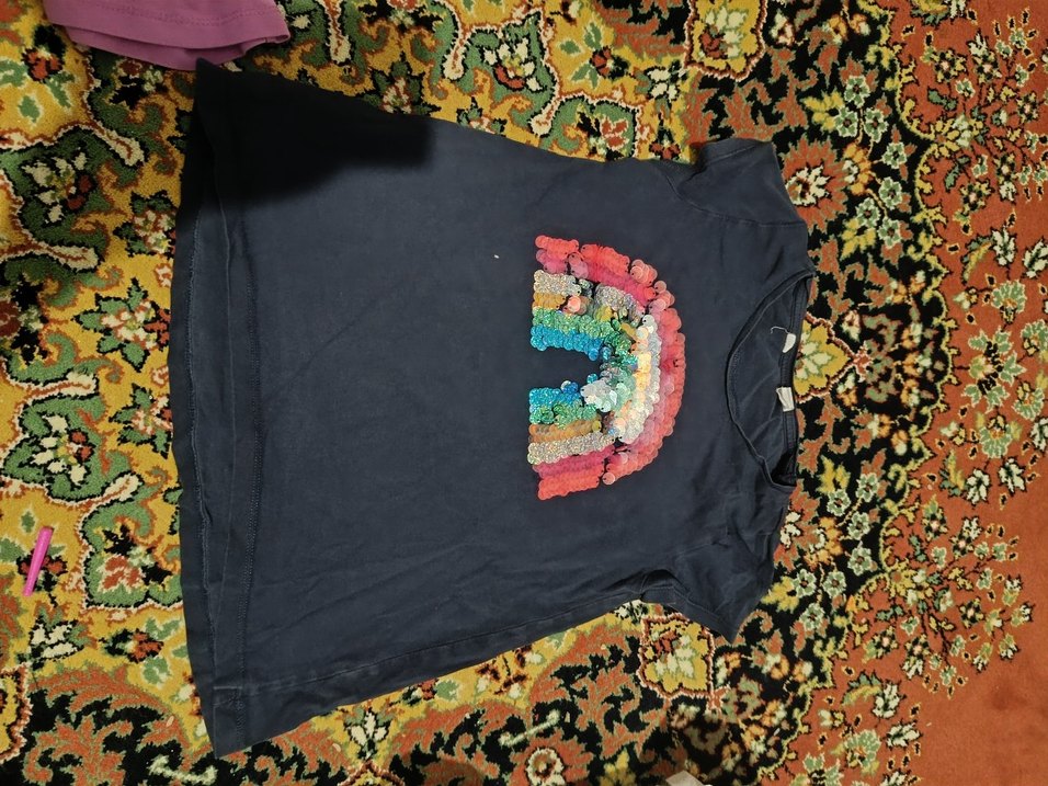 Kız çocuk tişörtü, bol kesim, kısa kollu ve yuvarlak yakalıdır. Renkli baskılı gökkuşağı ve fırfır detaylarıyla bohem tarzını yansıtır.