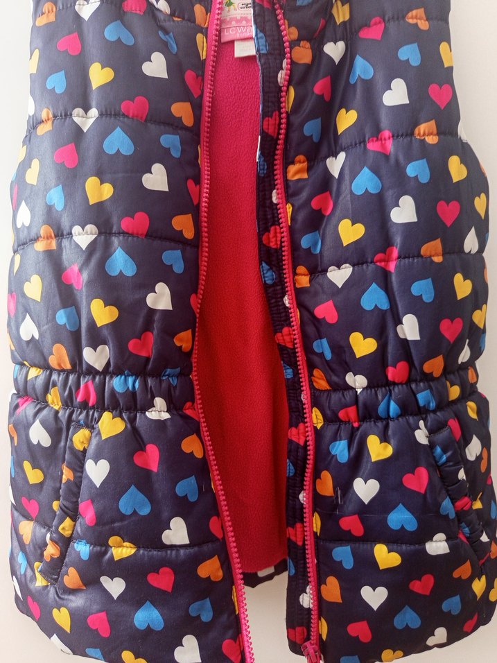 Renkli kalp desenli, fermuarlı kız çocuk yeleği. Sentetik kumaştan, V yaka ve kolsuz, rahat sokak tarzına uygun. ❤️