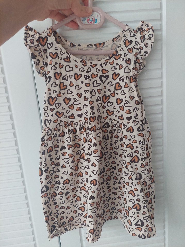 Kız çocukları için bol kesim, kısa kollu ve yuvarlak yakalı elbise, renkli kalp desenleri ve fırfır detaylarıyla. Yumuşak sentetik kumaştan, bohem tarzına uygun.