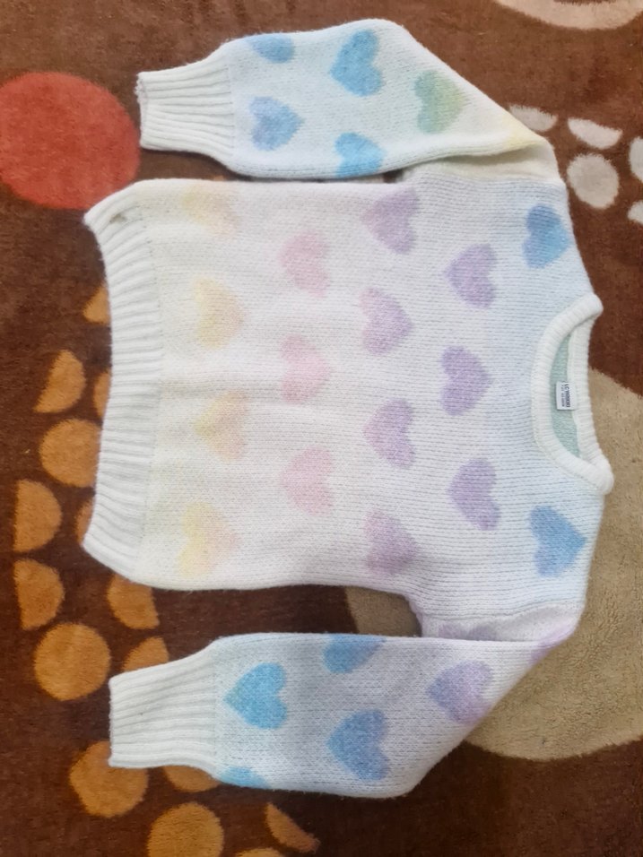 Örgü kız çocuk kazak, bol kesim, uzun kollu ve yuvarlak yaka detaylıdır. Pastel çok renkli batik desenli kalp figürleriyle trendy günlük stil için uygundur. kizim kazak giymiyor 1-2 kez giyildi sadece