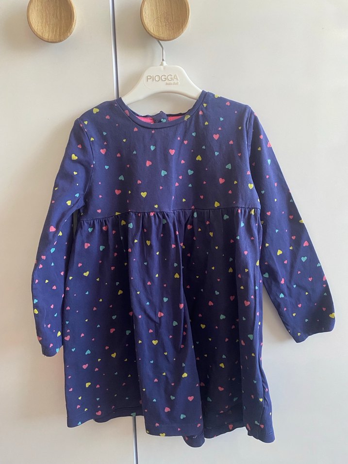 Kız çocukları için uzun kollu, bol kesim ve yumuşak dokulu kumaştan yapılmış elbise. Renkli kalp desenleri, fırfır detayları ve yuvarlak yaka bulunur.