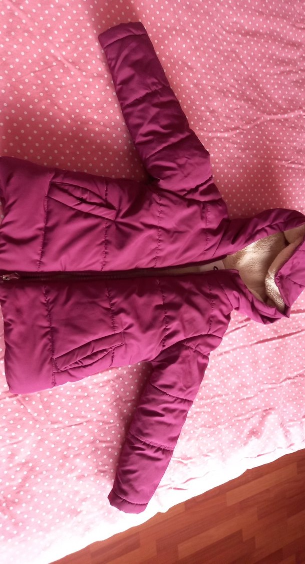 Fermuarlı ve yakalı, yumuşak ve sıcak kumaştan yapılmış, renkli pembe tonunda kız çocuk için dar kesim mont.