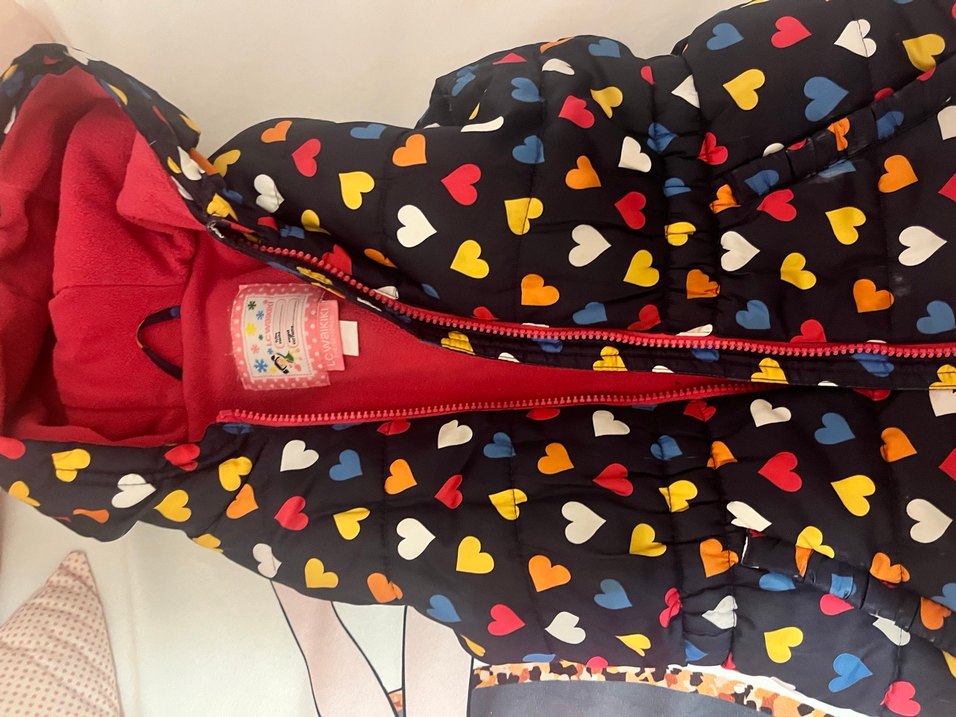 Renkli kalp desenli, kapüşonlu ve fermuarlı kız çocuk montu. Yumuşak ve sıcak fleece kumaştan üretilmiştir. ❤️