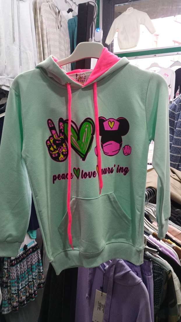 Kız çocuklar için uzun kollu, yumuşak kumaştan rahat kesim sweatshirt. Renkli barış, kalp ve ayı baskılı, kapüşonlu ve örme detaylıdır.