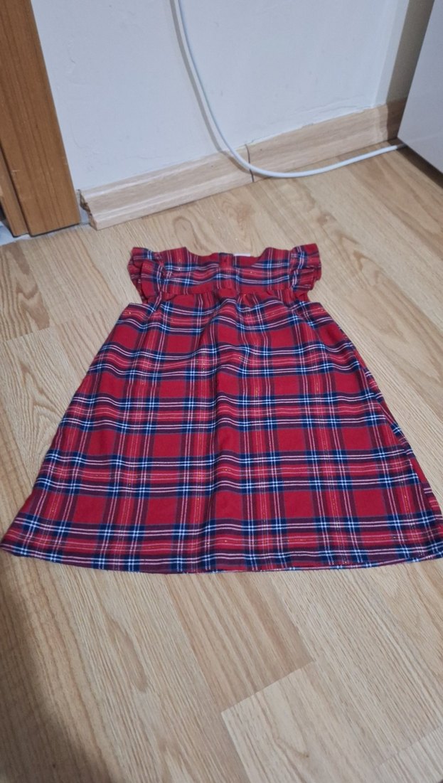 Kolsuz, kayık yaka ve fırfırlı detaylı kız çocuk elbisesi. Renkli kırmızı kareli desene sahip, sentetik kumaştan ve bol kesimdir.