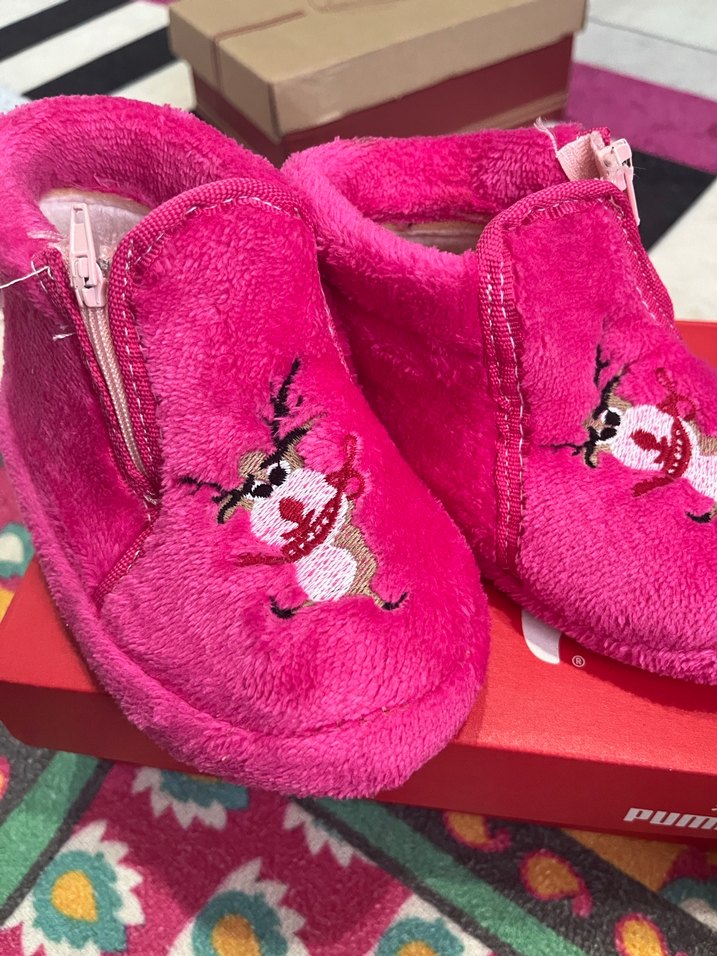 Renkli nakışlı ve fermuarlı, pembe yumuşak kumaştan kız çocuk ev terliği, sokak modasına uygun sıcak tutar.